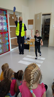 Opowiadał dzieciom o bezpiecznych zachowaniach oraz o niebezpieczeństwach jakie czyhają na drodze i nie tylko. Dzieci uczestniczyły w zajęciach praktycznych przypominając sobie zasady obowiązujące podczas przechodzenia przez ulice. Smerfom bardzo podobało się to spotkanie i słuchały go bardzo uważnie.
